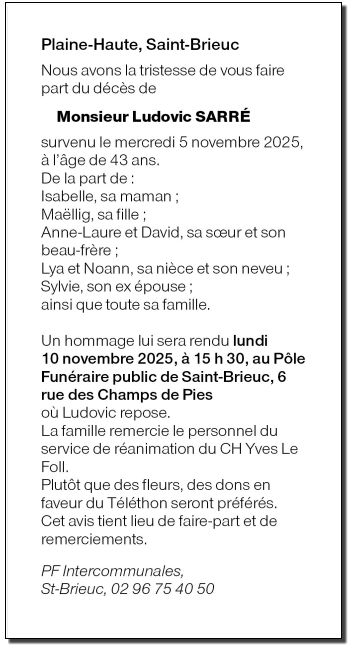 Décédé à Saint-Brieuc (22000, France) le mercredi 5 novembre 2025 à l'âge de 43 ans